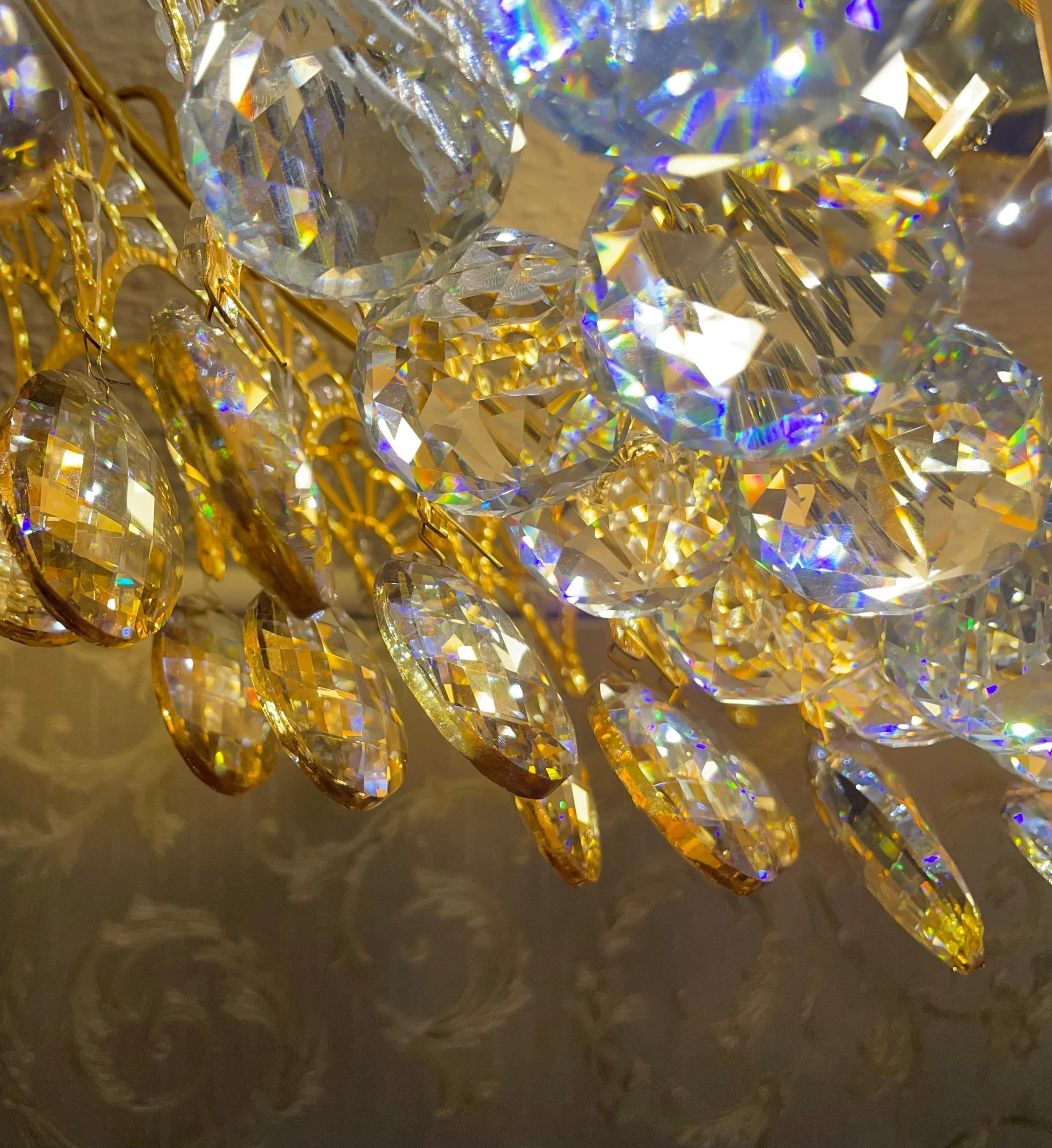 Ein Kristalllüster mit goldfarbenen Metallen und vielen facettierten Kristallen, die im Licht glänzen und Regenbogenfarben reflektieren.