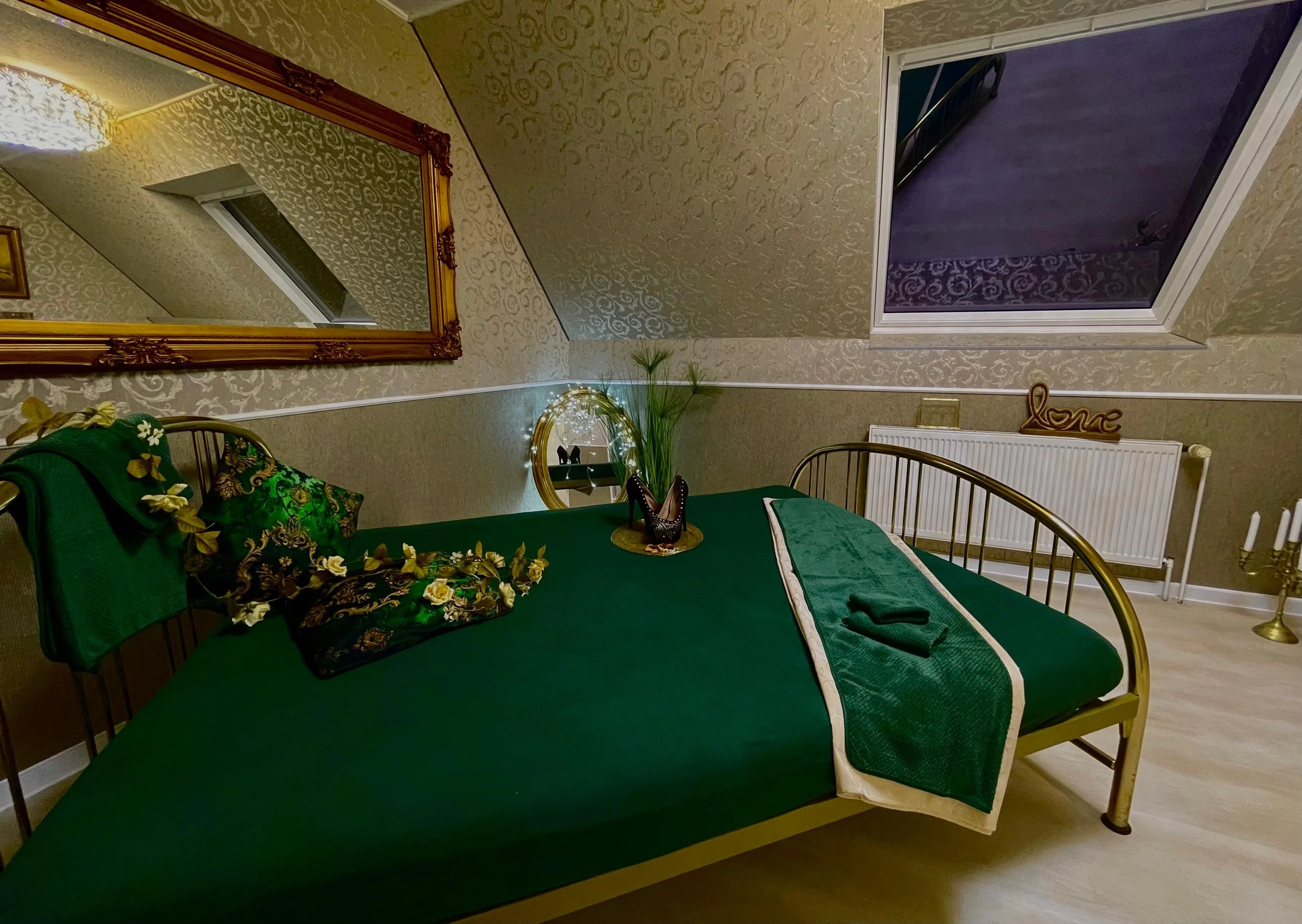 Ein Schlafzimmer mit grünem Bett, goldenen Bettgestell, Dekorationen wie Pflanzen, eine goldene Wanduhr, ein Spiegel, ein Love-Schriftzug und einem Kaminofen. Es gibt auch eine Dachluke und ein großes Wandspiegel.