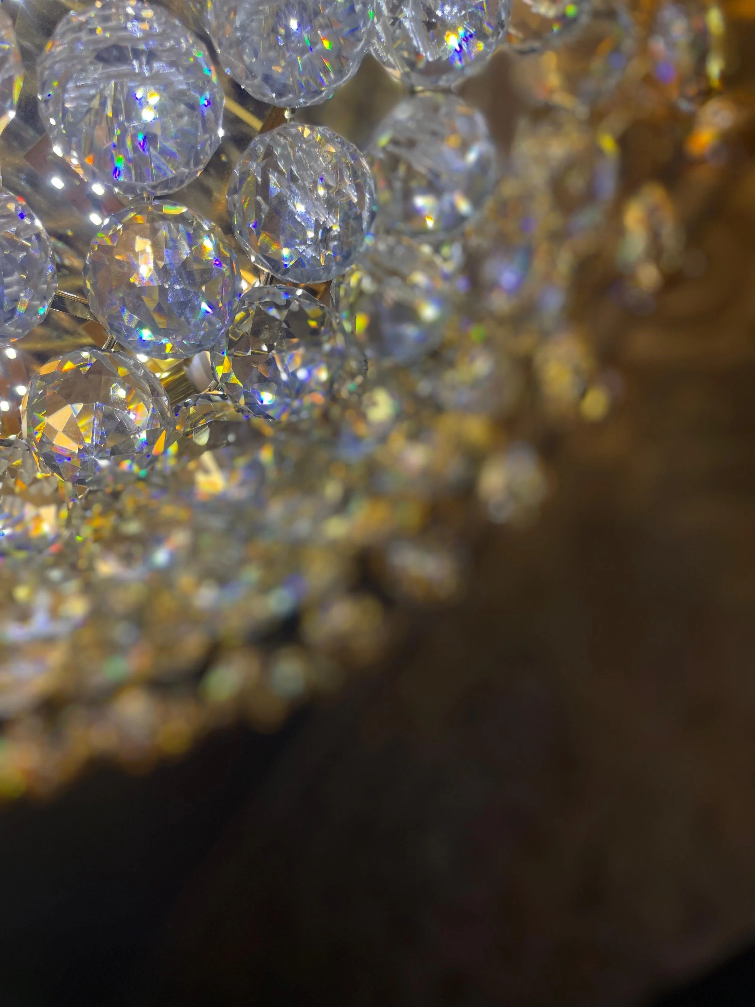Nahaufnahme von funkelnden Kristall- oder Glasperlen, die Teil eines Schmuckstücks sind, mit reflektierendem Glanz und bunten Lichtreflexen.
