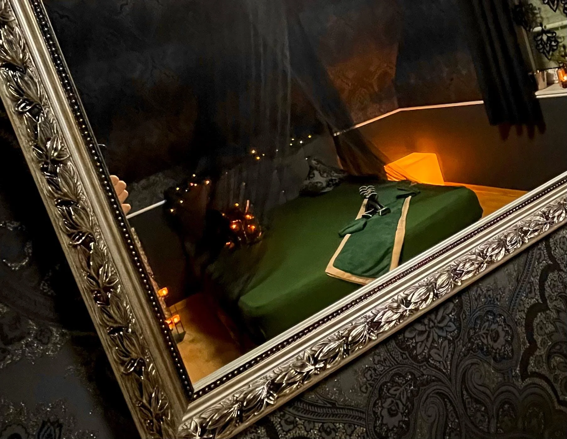 Ein Spiegel mit einem verzierten Rahmen, der einen Spiegel mit einem undekorierten Bett mit grüner Decke und schwarzen Kissen zeigt. Im Raum sind dunkle Vorhänge und orangefarbene Lichter sichtbar.