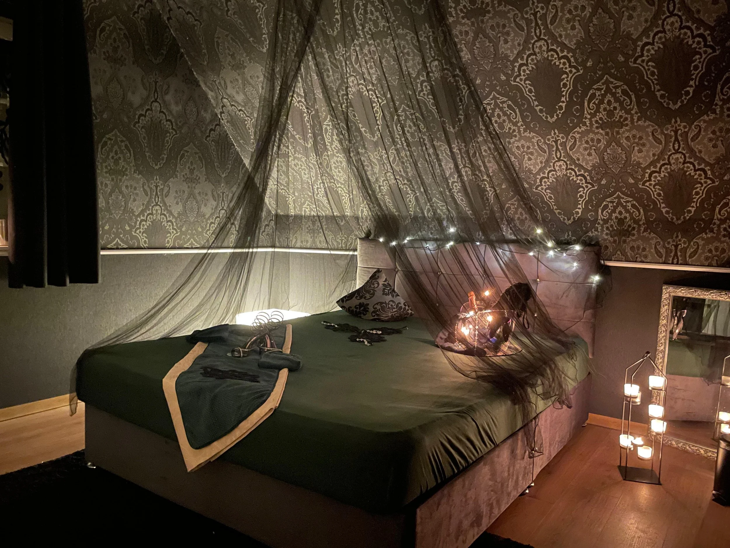 Ein Schlafzimmer mit dunkler Wanddeko, einem Bett mit schwarzen Bettlaken und einer dunklen Decke, umgeben von Dekorationen und Kerzenlichtern, mit einem schwarzen Schleier darüber.